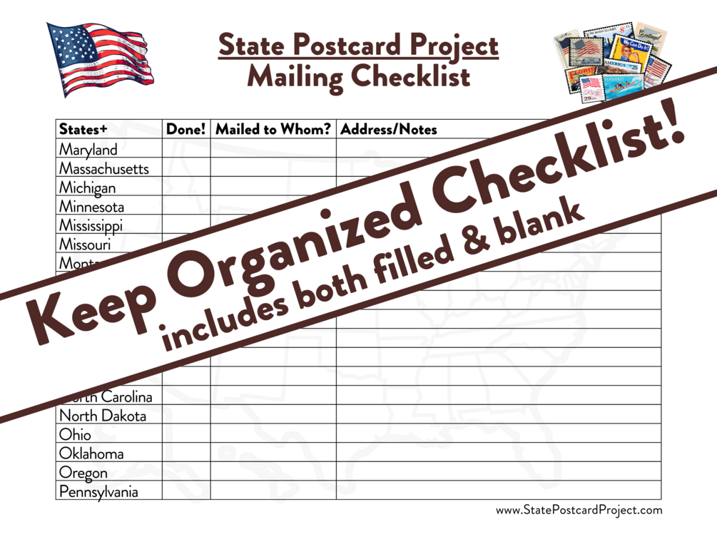 3/ blank & graph paper for drawing the USA! - STAY ORGANIZED(!) MAILING CHECKLIST to help you keep track of which states you've mailed to, received, addresses, and more!
